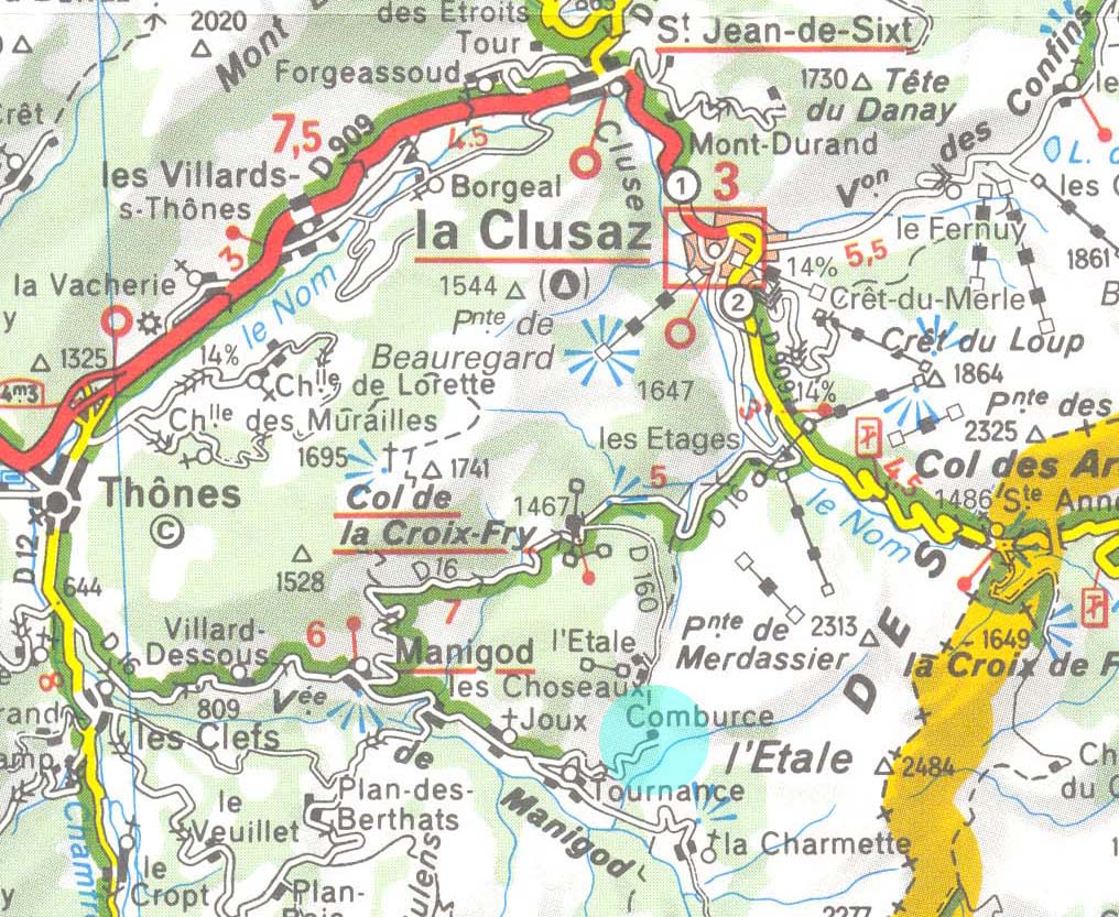 | Access: | Motorway to Bonneville. There take D12 to le Petit Bornand, Entremont, St Jean de Sixt. Once in St. Jean take D909 to la Clusaz. Once there follow for about 2 km road in direction to "col des Aravis". Then take road to the right driving to Manigod through the "Col de la Croix-Fry". In Manigod take road to "La Tournance". 250 m before La Tournance take road to the left to Combource. Park in Combource at the end of the road. The trip from CERN to Combource may take 1h30. |